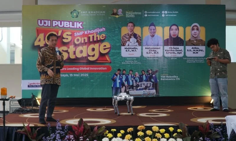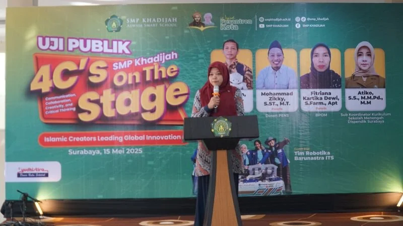 SMP Khadijah terus melatih siswa-siswi kelas 9 untuk menguasai kompetensi abad 21. Pembinaan yang dilakukan salah satunya melalui kegiatan unggulan yaitu Uji Publik 4C’s on Stage yang bertempat di Aula Yayasan Khadijah (15/5/2025). Sebuah kegiatan unjuk karya dan kreativitas hasil penelitian berbagai bidang. Ada 12 kelompok yang mempresentasikan hasil penelitian yang sudah dilakukan sebelumnya di depan dewan panelis. Para panelis yang hadir dalam kesempatan itu antara lain Mohammad Zikky, S.ST., M.T. (Dosen PENS Surabaya), Muhtadin, S.T., M.T. (Dosen Teknik Komputer ITS Surabaya, Pembina Tim Robotika Barunastra) dan Ibu Fitriana Kartika Dewi, S.Farm., Apt. (BPOM).