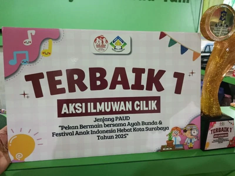 Sekolah Khadijah menorehkan prestasi gemilang kembali. Kali ini 5 murid TK Khadijah Sekolah Islam PAUD terbaik di Surabaya bersama Gurunya Ibu Mawaddah, S.Pd, M.Pd berhasil menjadi Terbaik 1 Aksi Ilmuwan Cilik Jenjang PAUD dalam ajang ” Pekan Bermain Bersama Ayah Bunda & Festival Anak Indonesia Hebat Kota Suraya Tahun 2025″. Lima murid dari TK Khadijah Jl.A.Yani No.2-4 Surabaya ini antara lain Sheza, Athariz, Aruna, Albara & Kaindra. “Semoga prestasi mereka sangat menginspirasi kepada anak-anak di seluruh Indonesia”, jelas Kepala KB-TK Khadijah Siti Malichah, S.Pd dengan penuh syukur.